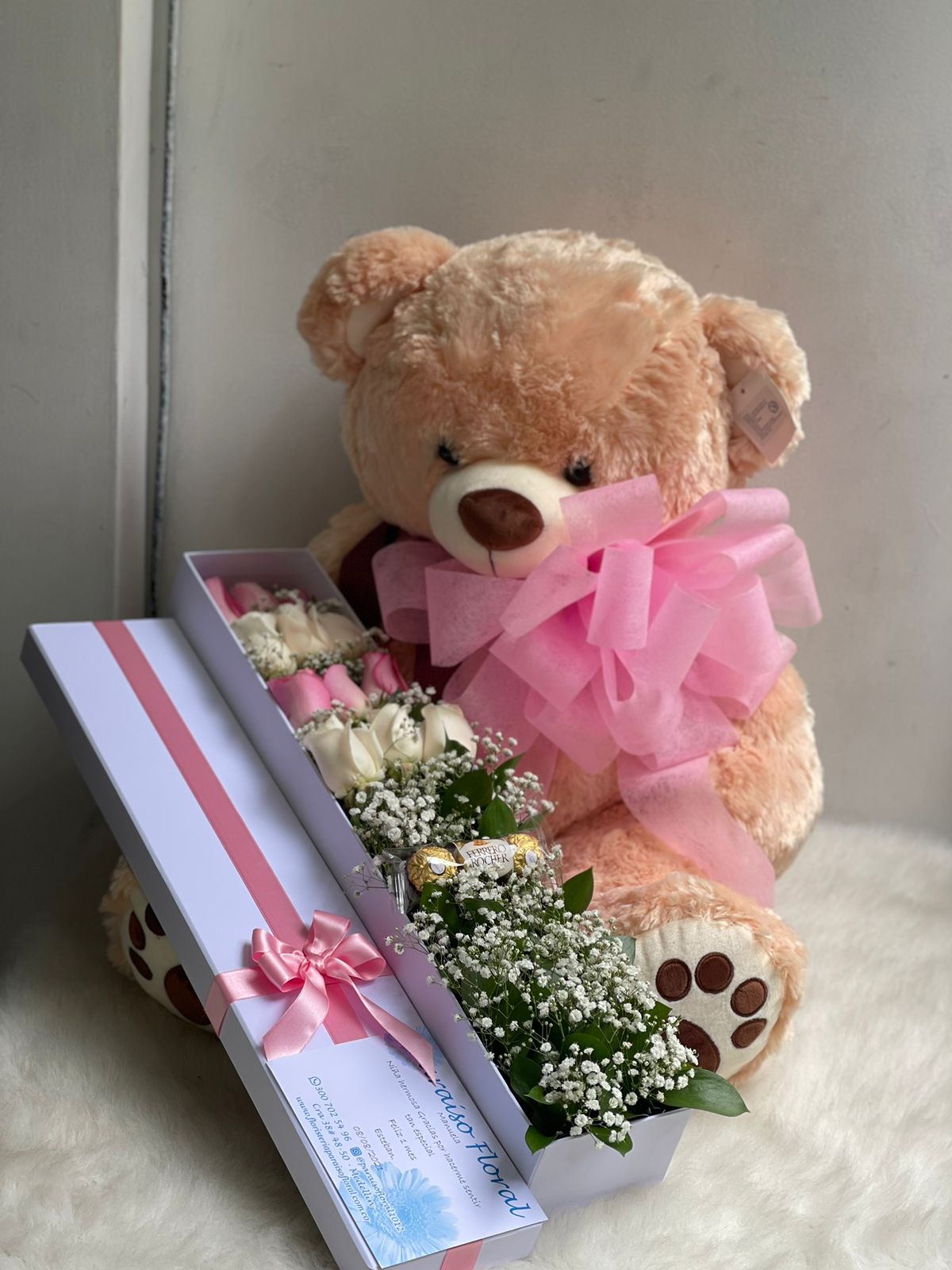 Peluche grande y caja de flores