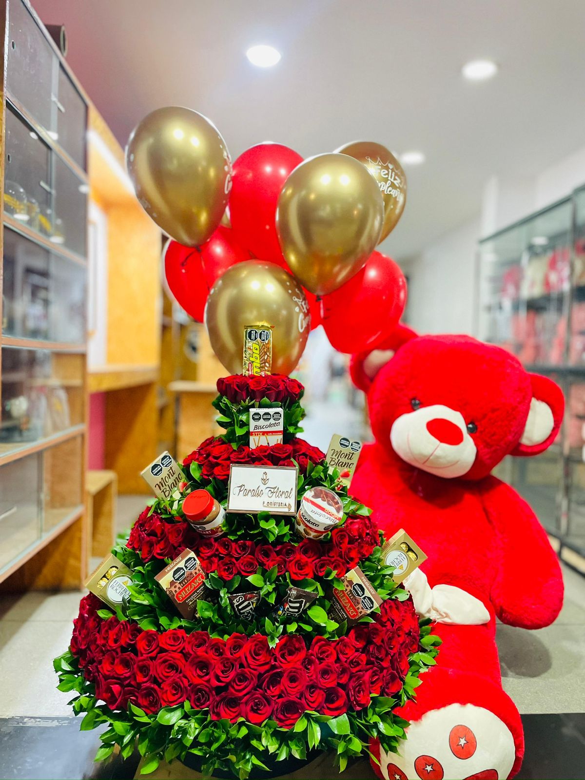Ramo grande rosas rojas y peluche rojo